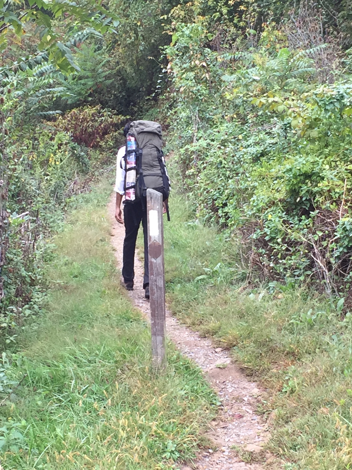 Meanwhile, I knew so little about this hike that I prepared for it like my grand adventure. I wore my best white linen shirt for it, along with some choice polyester pants. I borrowed my mate’s ex-Swiss military backpack with a huge, rigid frame. I stuffed it with a towel, a huge sleeping bag, and god knows what else. In the 200% humidity of the Appalachians, this made heavy work of a short walk.